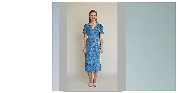 This gorgeous midi dress, with its vibrant blue flowers popping against a creamy background, looks like it just stepped out of a fancy garden party – but way more fun! It hits that perfect “not too long, not too short” spot, making it ideal for when you want to look super put-together without the drama of constantly tugging at your hemline. You can definitely show off your killer shoes, like the ones in the picture, without having to worry about tripping over your skirt during an impromptu dance-off or a mad dash for the last slice of pizza.