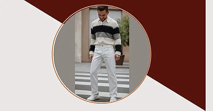 And let’s not forget that super cozy-looking striped sweater layered over a crisp white shirt – it’s like the perfect autumn hug for your upper half. Together with those pristine white pants and cool sneakers, this whole outfit proves that men’s fashion can be super chill and stylish without being fussy. He’s showing us that a cool pair of pants is the foundation for an awesome look, and sometimes, choosing something as eye-catching as white can really make you stand out – just try to avoid the muddy puddles and mystery street stains!