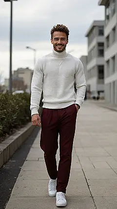 This guy clearly didn’t just roll out of bed and grab the first pair of pants he found. He’s strolling along, looking like he just aced a pop quiz or discovered pizza delivers itself. Those sharp burgundy pants, paired with the crisp white turtleneck, just scream “I’ve got it all together, and I know where all the good snacks are.” It’s the kind of outfit that makes you feel so put-together, you might accidentally start quoting Shakespeare or offering stock market advice – even if you just finished playing video games for three hours. This isn’t just a pants outfit; it’s a confidence costume!