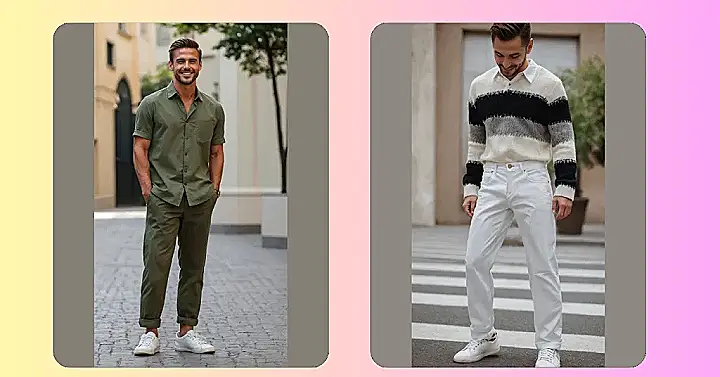 And let’s not forget that super cozy-looking striped sweater layered over a crisp white shirt – it’s like the perfect autumn hug for your upper half. Together with those pristine white pants and cool sneakers, this whole outfit proves that men’s fashion can be super chill and stylish without being fussy. He’s showing us that a cool pair of pants is the foundation for an awesome look, and sometimes, choosing something as eye-catching as white can really make you stand out – just try to avoid the muddy puddles and mystery street stains!