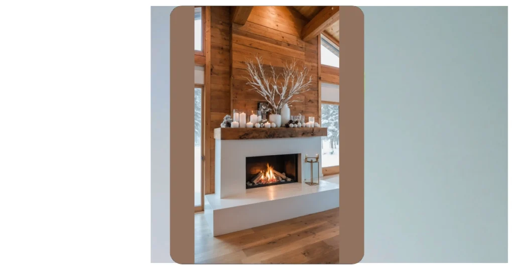 And let’s not even start on that mantelpiece! It looks like someone raided a fancy winter forest and then had a candle-lighting party that got a little out of hand – in the best way possible, of course. Those white, frosted branches look like they just drifted in from the snow outside, and the army of candles is working overtime to make sure this spot is the absolute brightest and warmest haven around. Plus, those cute little pinecones look like they’re wearing tiny snow hats, proving that even nature’s decor gets a glow-up when it’s part of the ultimate winter fireplace setup.