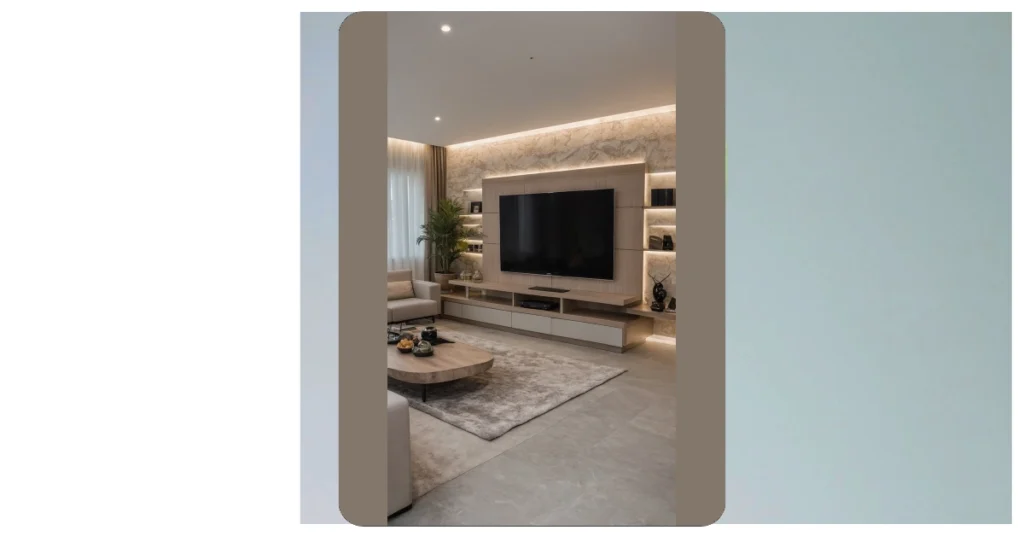 And it’s not just the TV wall that’s pulling its weight! Check out that super chic, curvy coffee table – perfect for holding snacks for your next binge-watching session without taking up the whole floor. The comfy-looking couch, while not a giant sectional, still promises a cozy spot to chill, and that plush rug just screams “barefoot friendly.” Every piece in this room, from the elegant plant to the subtle lighting, works together to make a small living room feel sophisticated and spacious. These clever furniture ideas prove that small can definitely be mighty stylish and comfy!