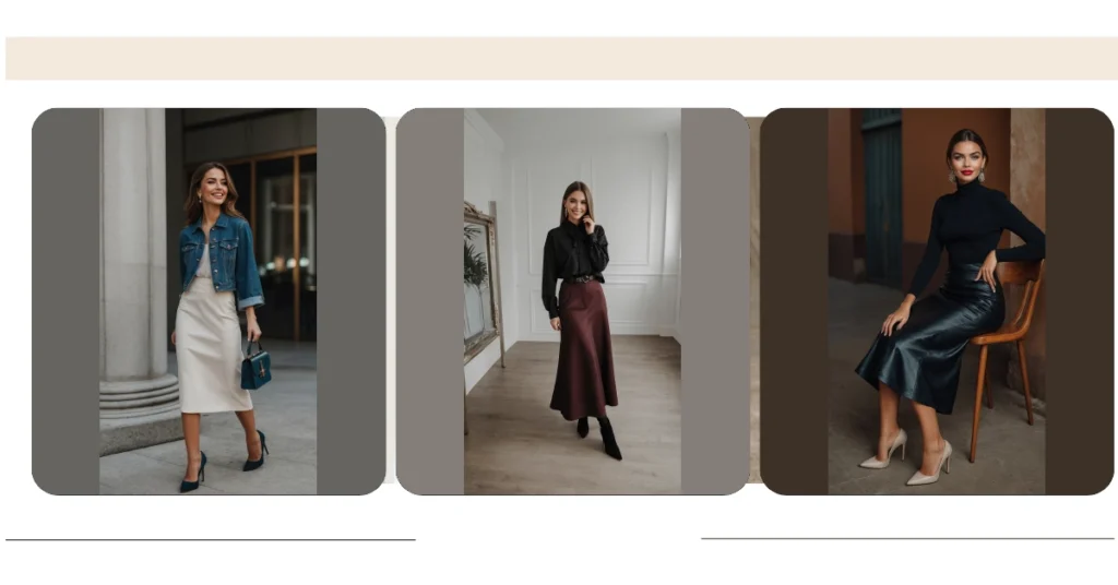 Finding the perfect holiday party outfit can sometimes feel like a mission to the moon, but this look totally nails it! That deep teal satin blouse? It practically screams “I’m festive and fabulous!” without even trying. Paired with that classy beige skirt, it’s a combo that’s elegant enough to impress your aunt, but cool enough to make your friends say, “Where did you get that?” You’ll be ready to snap some awesome selfies and maybe even try to sneak a few extra cookies when no one’s looking.