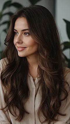 Look at that hair! It’s not just brown; it’s like a deep, luxurious coffee bean, or maybe melted dark chocolate that hasn’t quite hardened yet. Seriously, you could get lost in those waves. It’s the kind of rich brunette hair that probably has its own fan club and maybe even a personal assistant just for brushing. You almost expect it to shimmer and hum a little tune when the light hits it just right.