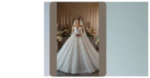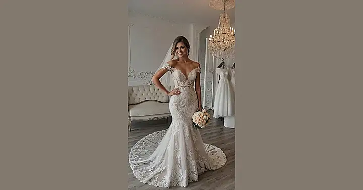 Looking at this dress, you can practically hear it saying, “Yup, I’m fabulous!” This isn’t just any wedding dress; it’s a ‘fit and flare’ masterpiece, meaning it knows exactly how to make a grand entrance. It hugs all the right places, making the bride look like she just stepped out of a fairytale with a serious glow-up. The fancy lace details and those cool off-the-shoulder sleeves? They’re basically screaming, “I woke up like this, flawless!”