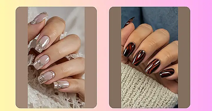 Look at these nails – aren’t they just purr-fectly mesmerizing? The way those shimmering lines of warm copper and deep brown swirl and catch the light makes them look like a fancy cat’s eye, always watching and sparkling. It’s not just a flat color; there’s a whole cool dimension to them, almost like magic! They’re definitely a step up from your everyday polish, giving off those mysterious, ‘I’ve got a secret’ vibes that make your hands instantly stand out.