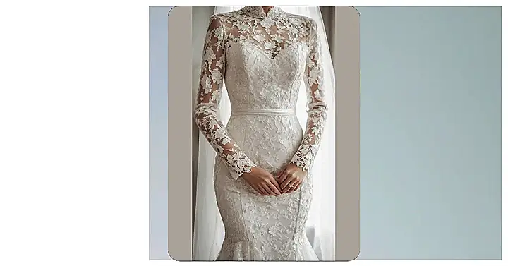 With a silhouette that hugs like a friendly but very stylish octopus (in the best way!), this gown flows into a lovely mermaid-style skirt that’s ready for a grand ballroom, or maybe just a very fancy photo op. And check out that dainty ring on the hand – probably a pretty important one, right? While it looks absolutely stunning and totally fit for anyone marrying into a monarchy, we’re also imagining trying to sit down for a massive wedding feast in something this elegant. You’d probably have to practice your ‘delicate nibble’ technique to avoid getting gravy on that pristine lace. But hey, for a day where you literally get to be a princess, a little extra elegance (and maybe a helpful assistant for snack breaks) is totally worth it!