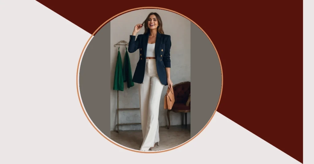 Check out this awesome outfit! This lady is totally rocking a dark blazer with those cool gold buttons, paired with super chic cream trousers. She looks so confident, like she just aced her final exam or maybe even convinced her parents to let her stay up late on a school night! Who knew trousers could make you feel ready to take on the world, or at least your next TikTok dance challenge? It’s proof that comfy pants can totally be dressy and make you feel like a total boss, ready for anything from a fancy dinner to just looking fabulous grabbing a snack.