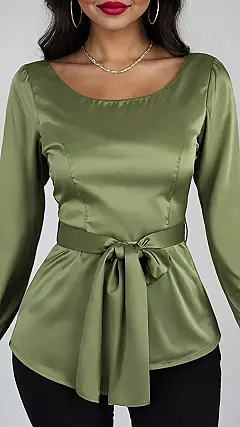 This green blouse is so slick, it practically whispers secrets about looking effortlessly put-together while you wear it. With that fancy tie belt cinching things in, it’s like the blouse is giving you a confidence high-five right around the middle. Plus, the way it shines? You might catch yourself checking your reflection more than your phone – and that’s saying something!