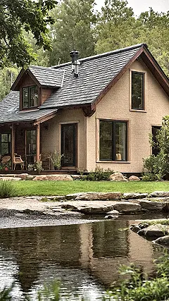 Forget trying to find your way through endless hallways in a giant mansion; this tiny house is all about smart style and cozy vibes! Look at those awesome stone steps leading up to the front door, just begging you to come in for a cup of hot cocoa. It’s got a sophisticated stone chimney that probably whispers tales of cozy winter nights, and that huge arched window isn’t tiny at all – perfect for spying on squirrels or staging your most dramatic selfie. This place proves that you don’t need a sprawling estate to make a big impression, just a whole lot of charm packed into a smaller, more manageable package.
