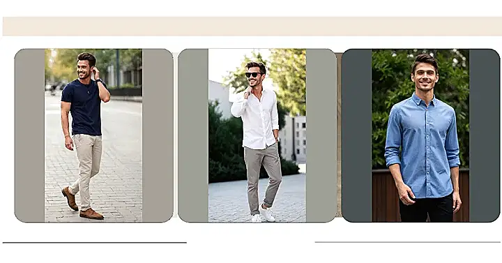 Feeling as confident as someone who just found a ten-dollar bill in their old jeans, this guy totally nails the ‘casual sharp’ look. His light, airy button-up shirt, perfectly paired with those cool trousers, practically shouts, “I’m ready for anything, from conquering my to-do list to maybe just chilling with that distant palm tree.” He’s rocking that classic shirt outfit, proving you don’t need a superhero cape to feel awesome – sometimes, just a crisp collar and a big smile do the trick.