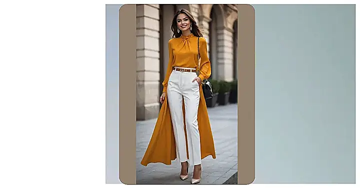 This isn’t your grandma’s button-up; this blouse outfit is on a whole other level! That amazing golden yellow blouse looks like it’s ready for anything, maybe even leading a fashion revolution. It’s got this cool high neck and flowy sleeves that make it look super fancy but also comfy, paired perfectly with crisp white pants and a belt that means business. Rocking a blouse this bold probably makes you feel like you could take on the world, or at least finally figure out that tricky math problem.