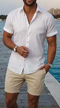 Forget about those stuffy jeans or long trousers when the sun decides to crank up the heat. This outfit, especially those comfy mens shorts, is basically a cheat code for looking effortlessly cool. You could be strolling along a boardwalk, grabbing an ice cream, or even just pretending to own a yacht – these shorts have got your back (and your legs!). Just be warned: wearing them might make you suddenly want to book a vacation, or at least convince your friends that your backyard is now a five-star resort.