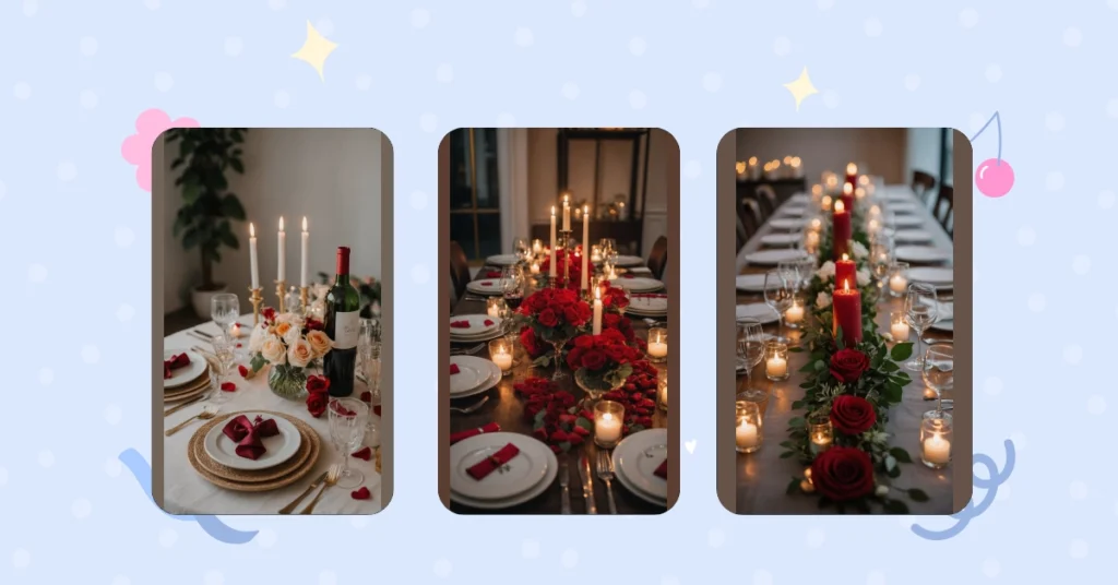 Feeling fancy tonight? This dinner table totally screams ‘special occasion’ louder than your alarm on a Monday morning! Look at those flickering candles – they’re not just for light, they’re basically tiny mood generators, making everything glow with a warm, cozy vibe. It’s like someone decided to turn down the harsh overhead lights and declare, “Tonight, we dine like royalty, but, like, super chill royalty!” All those red and pink roses, scattered petals, and even a single rose on each plate just take the effort level from ‘zero’ to ‘hero’ in seconds.