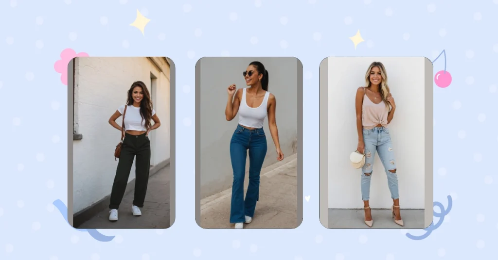 And speaking of popping, check out those jeans! High-waisted and wide-leg with just the right amount of rips – they scream ‘I’m stylish, but I also enjoy maximum snack capacity and freedom of movement.’ This outfit proves that ‘basic’ is anything but boring when you pair a sleek tank with some seriously cool denim. Add a cute little handbag and a confident smile, and you’ve basically got your next go-to look for school, hanging with friends, or just feeling like you’re ready to take on the world (or at least your next TikTok challenge).