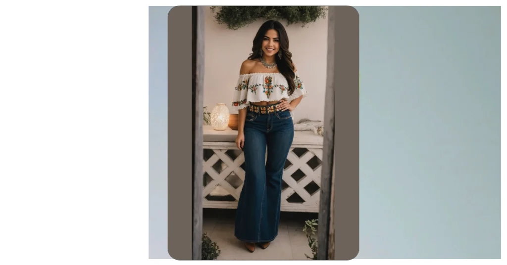 Now, let’s zoom in on that adorable top! It’s not just a basic white shirt; it’s got all these colorful, super cool embroidered details that scream ‘traditional Mexican charm’ but make it fashion-forward. It’s like her shirt is hosting a tiny, cheerful fiesta! And those wide-leg jeans? They look so comfy, you could probably do a cartwheel in them and still look effortlessly stylish. This whole outfit effortlessly blends classic ranch vibes with a vibrant, friendly twist, proving you can look amazing without sacrificing comfort – perfect for adventuring, or just looking fabulous while hanging out.