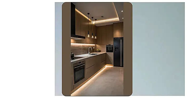 This kitchen isn’t just where food lives; it’s like a glowing, futuristic command center for whipping up anything from midnight cereal to fancy pizza rolls. See those cool lights tucked everywhere? Under the cabinets, near the floor, even up by the ceiling! It makes the whole place look super slick, like something out of a movie, and honestly, with lighting this good, you’ll never lose that last cookie crumb hiding in the corner. It’s basically designed to make finding snacks an adventure.