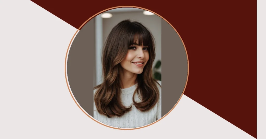 These aren’t just any bangs; they’re the kind that elegantly part down the middle, like a velvet curtain opening for a show-stopping performance (which is your face, obviously!). They work like magic with long hair, just like our smiling friend here shows off, adding a touch of effortless cool without feeling too heavy or in-your-face. Plus, if you ever decide you want to switch up your look, they grow out super gracefully, blending into your layers without that awkward ‘half-bangs, half-forehead’ phase. It’s basically the hairstyle equivalent of having your cake and eating it too, looking fabulous the whole time!