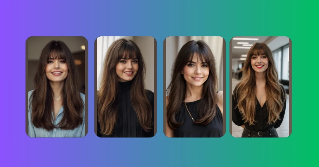 These aren’t just any bangs; they’re the kind that elegantly part down the middle, like a velvet curtain opening for a show-stopping performance (which is your face, obviously!). They work like magic with long hair, just like our smiling friend here shows off, adding a touch of effortless cool without feeling too heavy or in-your-face. Plus, if you ever decide you want to switch up your look, they grow out super gracefully, blending into your layers without that awkward ‘half-bangs, half-forehead’ phase. It’s basically the hairstyle equivalent of having your cake and eating it too, looking fabulous the whole time!