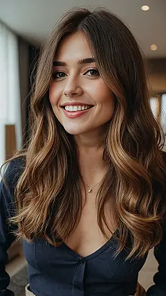 The best part about these curtain bangs, especially with gorgeous long waves like hers, is how incredibly versatile they are. One minute you’re rocking a casual school day, looking perfectly put-together, and the next you’re ready for a weekend hangout, feeling totally chic. They give off that “I woke up looking this fabulous” energy, even if you spent five minutes wrestling with your brush to get that perfect swoosh. It’s like having a built-in confidence booster that always knows how to make you look photo-ready and ready to conquer whatever your day throws at you!
