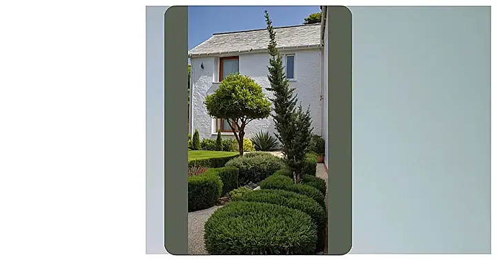 Stepping into this front garden is like walking into a meticulously curated art exhibit, but with way more oxygen and zero ‘don’t touch’ signs! You’ve got bushes shaped so perfectly they could be giant green pillows, and others lined up like a disciplined army, ready for inspection. That one main tree with its neat, round haircut stands proud in the middle, probably wondering if its friend, the super-tall skinny tree, is ever going to stop trying to peek over the roof.