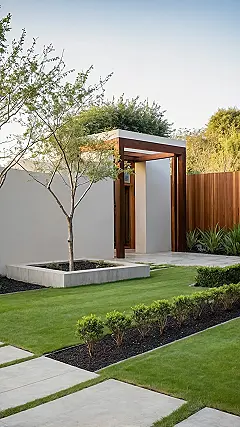 Look at that little tree chilling in its concrete planter, looking all cool and minimalist like it just stepped out of a magazine photoshoot. It’s got its own little spotlight, surrounded by perfectly dark mulch that probably costs more than my entire snack budget for a month. Then there’s that slick wooden archway, looking like the entrance to a super exclusive club where the only entry requirement is appreciating perfectly trimmed hedges. Those stepping stones across the lawn are basically an invitation to play hopscotch, but you’d feel too guilty messing up such pristine grass. This front garden isn’t just a garden; it’s a meticulously crafted outdoor art exhibit that probably gives tours on weekends.