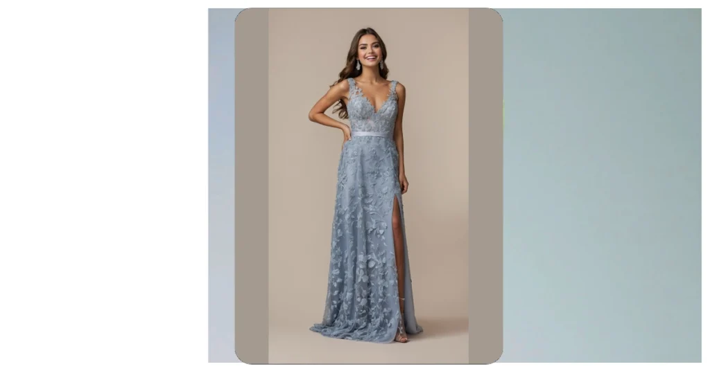 Check out this dress! It’s like someone gathered all the prettiest dusty blue flowers and stitched them onto a cloud, then added a little sparkle and a sassy slit just in case you need to bust out a surprise dance move. This isn’t just a dress; it’s a confidence booster wrapped in petals. You’ll be gliding through the room, looking effortlessly amazing, ready to conquer any awkward group photos or make an entrance that drops jaws (in a good way!).