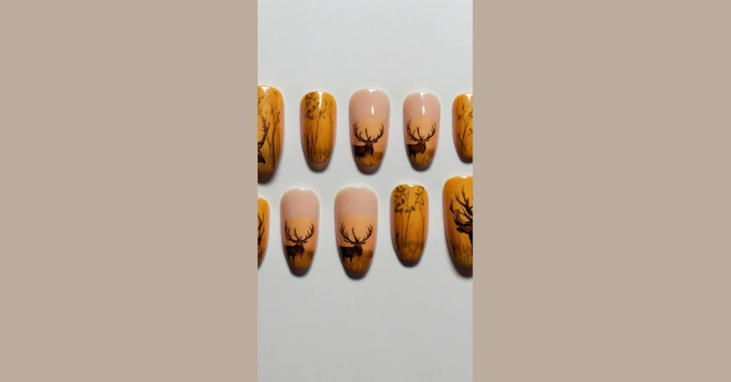 These nails are totally rocking those gorgeous fall colors, like a sunset painted right onto your fingertips, making them perfect for pumpkin patch visits or cozy sweater weather. Whether you’re feeling woodsy chic or just want to add a touch of forest magic to your everyday look, these deer prints are sure to get people talking. Plus, who needs a subtle shimmer when you can have a full-blown stag showing off its impressive antlers on each nail?