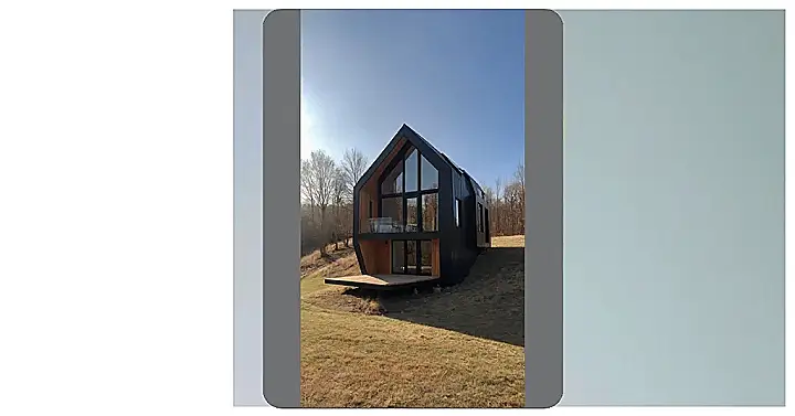 Check out this rad little house! It’s a real micro house, proving you don’t need a giant mansion to look super cool. This one’s all sleek black and warm wood, looking like something straight out of a magazine but tiny. See the huge windows and that sweet balcony? It’s designed to let you stare at trees all day, which is way better than staring at homework. It might be small, but it’s definitely making a big statement chilling there on that hill, blending modern style with all that nature around it.