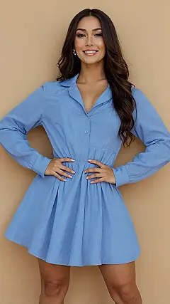 This awesome mini shirt dress in a cheerful blue color is like your favorite comfy button-up shirt decided to level up and become a super stylish dress! It’s seriously perfect for those mornings when you want to look totally put-together without spending an hour rummaging through your closet. Just button it up, maybe add some cool sneakers or sandals, and you’re officially ready to conquer the day, whether it’s acing a pop quiz or grabbing a smoothie with your besties.