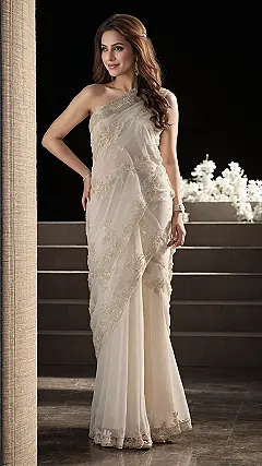 Look at this fantastic saree! While the light, flowy fabric of the saree itself is doing its elegant thing, you just know the real MVP here is that stunning saree blouse. It’s absolutely sparkling with all that fancy gold embroidery, practically yelling, ‘Hey, look at me!’ This blouse isn’t just a sidekick; it’s the main event, taking this whole outfit from ‘pretty good’ to ‘jaw-dropping awesome.’ It’s like the saree is the cool, calm friend, but the blouse is the one bringing all the dazzling energy to the party!