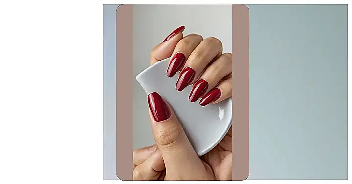 Check out these nails! They’re totally giving main character energy with that awesome deep red color and super shiny finish, looking like the ultimate red acrylics. You know those nails that just look ready for anything, whether it’s making a dramatic hand gesture or just holding your phone with extra flair? Yep, these are them, long and shaped just right to make a statement without saying a word.