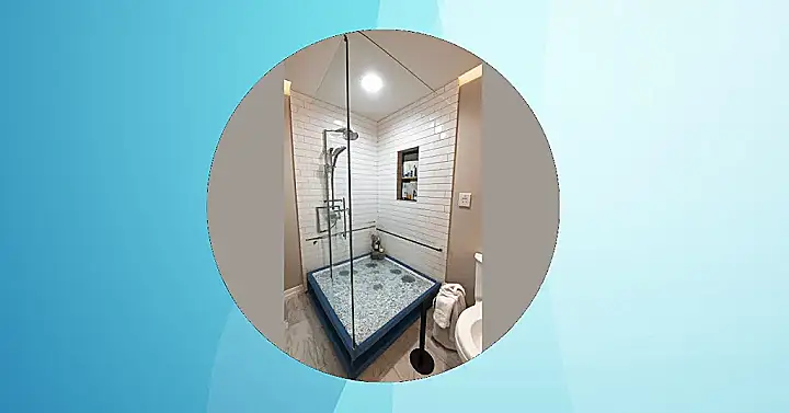 Beyond the awesome floor, this bathroom remodel really nailed the details! Peeking through the shiny glass, you’ll spot not one, but two shower heads – perfect for when you need a gentle rainfall *and* a blast of energy. Those sleek grab bars aren’t just for show either; they’re there to help you strike a pose like a pro singer or simply keep steady if your legs get wobbly from all the relaxation. And don’t miss that clever little built-in nook for all your shampoos, proving that even your toiletries can live in style. This whole setup makes you wonder if you should start charging admission for bath time!
