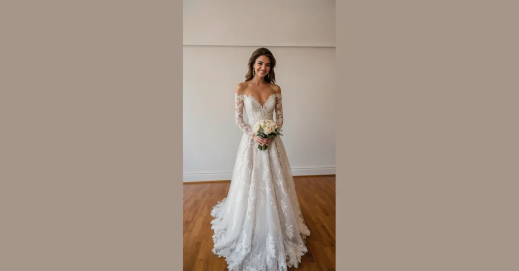 This wedding dress is so gorgeous, it looks like it stepped right out of a fairy tale, but with way better Wi-Fi. Our bride here is absolutely glowing in her off-the-shoulder gown, ready to hit the aisle or maybe just expertly dodge a rogue bouquet toss. Notice how the top hugs her just right before the big, floaty skirt takes over? That’s where the famous “Basque waist” comes into play, a super clever design that gives your waist a little extra definition, often dipping gently in the front. It’s like the dress itself is saying, “Hello, beautiful silhouette, nice to meet you!”