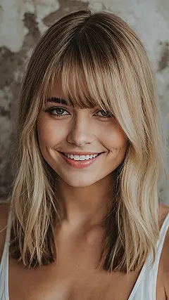 This amazing smile is absolutely infectious, and it’s perfectly framed by those fantastic bangs! It’s like her hair knows exactly how to highlight her bright eyes and cheerful expression, giving her a super fresh and friendly vibe. Getting a bangs haircut can feel like hitting a refresh button on your entire look, instantly transforming your style from “just rolling out of bed” to “ready for anything.” It’s a fun way to experiment without chopping off all your length, proving that sometimes, just a little fringe can make a huge difference in how you feel and look.