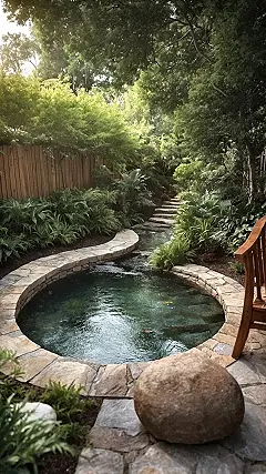 Forget about boring lawns or giant flowerbeds you never have time for; this small garden is all about maximum coolness with minimal fuss. That circular pond looks like the perfect spot for a rubber ducky race, or maybe even just a peaceful place to dip your toes after a long day of, well, being a grade 9 student. With that little stream bubbling down past the stepping stones, you’ve got natural sound effects that beat any meditation app. It’s the kind of spot where you half expect a friendly garden gnome to pop out and offer you a tiny cup of tea, proving that size definitely doesn’t limit the amount of magic a garden can hold.