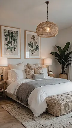 Walking into this room is like getting a warm hug from the decor itself. That bed practically has its own zip code, and with all those fluffy pillows, you might accidentally get lost before you even get under the covers. The soft light makes everything glow like a warm marshmallow, and that rug looks perfect for just flopping onto. It’s the ultimate base camp for epic snoozes and potentially world-record-breaking pillow fights (though the vibe is so chill, maybe just gentle pillow snuggles).