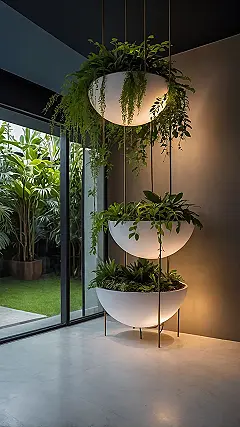 Forget dusty old pots in corners! This picture shows plants living the absolute high life, literally stacked up like a leafy skyscraper. I mean, look at them, all chill and hanging out in their cool glowing bowls suspended in mid-air. It makes you wonder if they have tiny plant parties up there after dark or if the bottom plants are jealous of the top ones getting more sun. This is serious indoor plant decor goals, turning a regular space into something way more interesting and green, proving your plants can aim high!