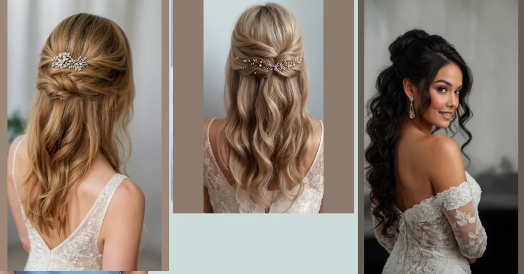 This look is a total win for any bride who wants to feel stunning without feeling totally “done up.” It’s super versatile, letting your hair move naturally while still looking put-together, which means less worrying about flyaways and more time for celebrating. And honestly, who wants to spend their wedding day fussing with a hairstyle that feels like a heavy helmet? This elegant half-updo, complete with delicate curls and a touch of sparkle, says, “I’m here to get married, have fun, and maybe eat cake without hair getting in the way!”