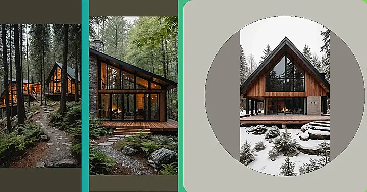 Check out this seriously slick forest cabin! It’s like someone took all the cozy vibes of a rustic hideaway, gave them a high-five with a modern design magazine, and then plopped it down in a snowy wonderland. You’ve got that huge window practically inviting the forest inside, but from the comfort of a warm chair next to a crackling fireplace. It’s probably saying, “Hey frosty trees, nice try with the chill, but I’m over here with my hot cocoa and zero frostbite, thanks!” It’s the perfect spot to pretend you’re an intrepid explorer, but with central heating and probably excellent Wi-Fi.