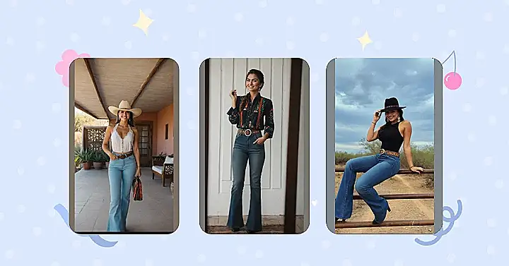 Those flared jeans are giving off major throwback cool, perfect for kicking up some dust on the rancho or just, you know, strutting down the hallway like you own the place. She’s smiling like she just found out her horse can make coffee, or maybe she just loves how comfy yet totally put-together this look is. This outfit proves you don’t need a lasso to look amazing – just some awesome embroidery, a killer belt, and a smile that says, “Yep, I’m this fabulous!”