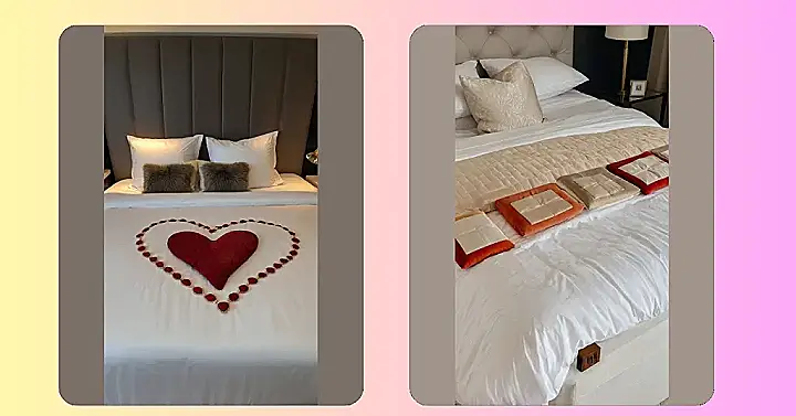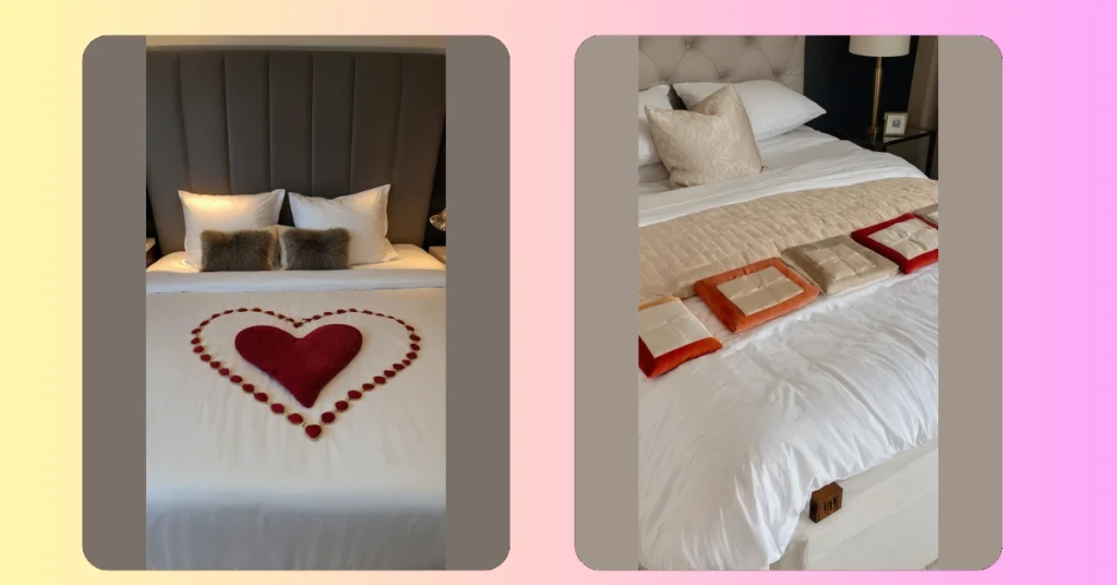 You know, this setup looks so grand, it almost makes you wonder what you’re even supposed to do with it. Do you just stare at the heart decor all night? Or do you carefully tiptoe around it when you get into bed, trying not to mess up the perfect arrangement? It’s like a masterpiece you don’t want to disturb! And those fuzzy pillows? They look like they’re ready for some serious cozy lounging after all the “oohing and aahing” over the romantic gestures. It’s pretty clear this bedroom wants you to feel like royalty, or at least like someone who deserves a really cool, heart-decorated snooze.