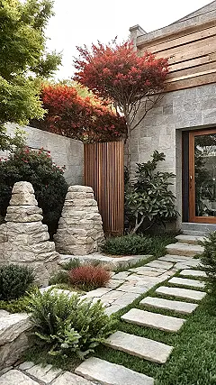 This garden proves you don’t need acres to have an epic outdoor space. Forget those sprawling estates that require a small army just to mow the lawn; this spot is all about maximum chill with minimal fuss. From the perfectly placed stepping stones that practically invite you to wander (even if it’s only ten steps!) to that amazing red tree showing off its vibrant autumn colors, it’s proof that good things truly come in small packages. Plus, those stacked stone sculptures look like they’re either guarding the entrance or patiently waiting for their turn to take a very serious rock selfie.