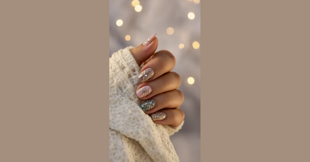 And can we talk about those incredible details? Each nail is like its own tiny winter wonderland, from the delicate silver snowflakes dancing on the pink background to the sparkly green design that looks like it could be a fancy festive wreath. You’ll be unwrapping presents or holding hands for carols with the most stylish digits in town. These nails aren’t just a fashion statement; they’re basically a tiny holiday party happening right on your hand, making sure you’re always feeling extra festive and fabulous!