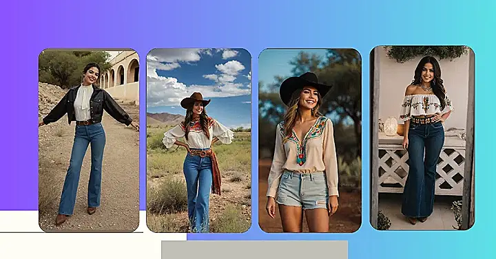 And let’s not forget the details! That white halter top with all its pretty lace looks ready for a stylish rancho fiesta, while those light blue flared jeans are practically begging for a two-step. The cool, carved belt buckle isn’t just holding up her pants; it’s practically an award for best dressed at the ranch! With that patterned bag, she looks prepared for anything, whether it’s collecting fresh farm eggs or just slaying the style game. It’s a Mexican rancho outfit that says, “I’m here to have fun and maybe ride a horse, but definitely look good doing it!”