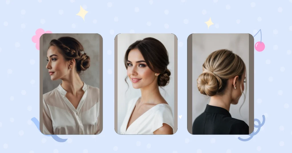 This kind of bun is a total MVP for any big day, especially a wedding. You won’t have to worry about your hair drooping halfway through the ceremony or getting tangled when you bust out your best moves on the dance floor. Plus, notice that super cute sparkly earring in the picture? A simple, clean bun like this lets cool accessories (and your own awesome neck and shoulders, showing off that snazzy dress strap!) really shine, instead of being hidden behind a waterfall of hair. It’s basically the smart choice for looking fabulous and staying comfy, so you can focus on the important stuff, like who gets the last slice of cake!