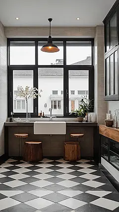 Who knew geometry could be so stylish? This checkerboard floor isn’t just a blast from the past; it’s practically a crystal ball, showing us what epic designs will still be trending for Checkerboard Floor Tile Design in 2026. While you’re busy staring out that massive window, maybe dreaming up your next TikTok dance or wondering if you left your homework at school, these tiles are quietly giving your space serious personality. Plus, if you ever lose your phone charger, at least you’ve got a built-in grid system to help you search! It’s the kind of floor that makes even doing dishes feel a little bit like a fancy event, especially with those cool industrial lights overhead.