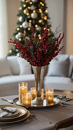This holiday centerpiece is practically a superhero of holiday decor, swooping in with its vibrant red berries and fresh green sprigs to save any plain table from boredom. It’s so picture-perfect, you might even forget those berries aren’t for snacking – trust us, they’re more for show than for your stomach! This arrangement is definitely giving off major ‘festive and fabulous’ energy, making your dining area look like it just stepped out of a holiday movie.