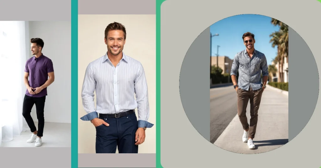 Think about it: this shirt isn’t just for looking good; it’s a multi-tasker. It’s polished enough that your parents would approve, but relaxed enough that you won’t feel like you’re wearing a costume. Plus, with those sleeves rolled up and sunglasses on, he looks ready for anything – maybe he’s off to grab a smoothie, ace a pop quiz, or simply enjoy the sunshine without squinting. It’s a great example of how a simple shirt outfit can give you that extra boost of confidence, helping you tackle your day with a smile, just like our friend here who seems pretty happy with his fashion choices!