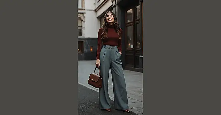 This outfit is basically a masterclass in looking effortlessly cool while probably feeling like you’re wrapped in a cloud. Our smiling style icon here proves that wide-leg trousers are not just for your grandma’s vacation photos. These flowy pants, hugging her waist with that snazzy belt and then gracefully going wide, are screaming, “I’m chic, but also, I can totally do a high kick if needed!” Paired with that deep red turtleneck, she’s ready to conquer the day or at least comfortably walk around looking amazing.